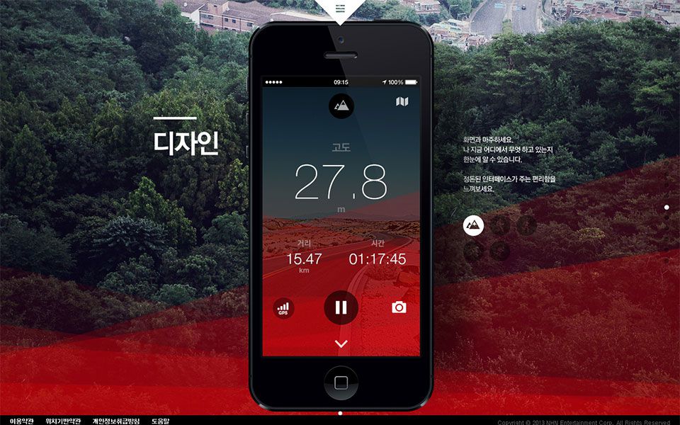 흰색의 타이포 그라피와 빨간색의 보조색으로 사진과 디자인 오브젝트들의 퀄리티를 보강하고 있다.