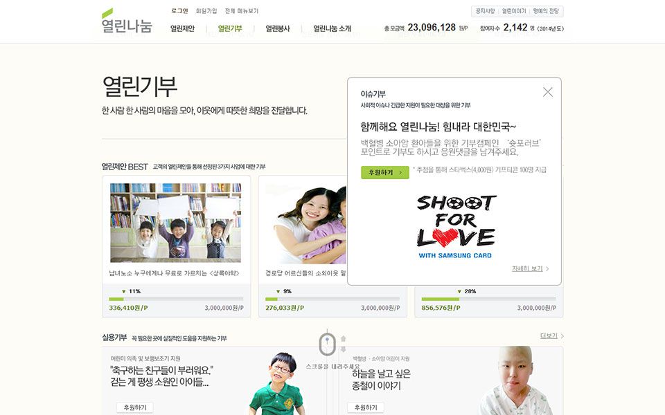 메인은 세로 스크롤로 각 1뎁스에 대한 컨텐츠들을 볼 수 있다. 세부 페이지로 이동하려면 전체 메뉴를 보거나 스크롤되어 이동된 곳에서 클릭하면 된다.