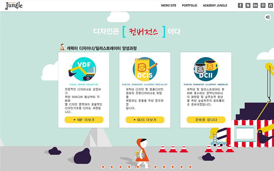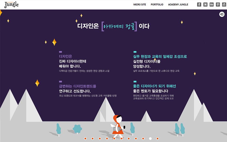 마우스 휠 또는 네비게이션 버튼으로 가로 스크롤되어 진행되는 컨셉의 사이트이다.