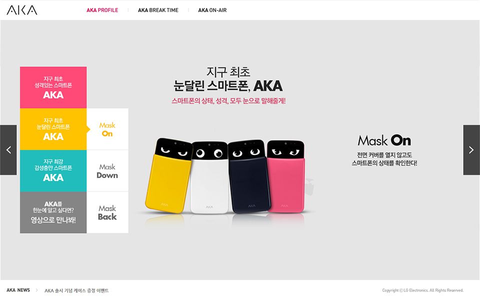 제품의 컬러인 노란색, 분홍색, 파란색들의 UI들을 볼 수 있으며, 컨텐츠를 휠의 움직임에 따라 좌 우로 스크롤링 된다.