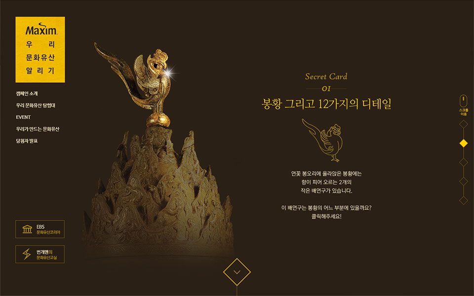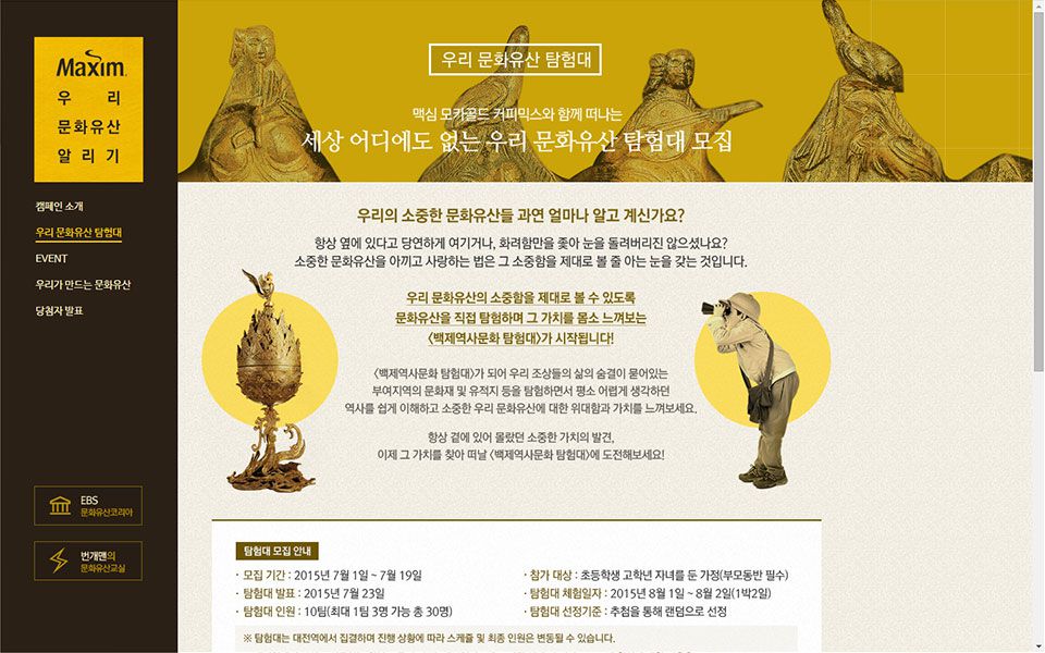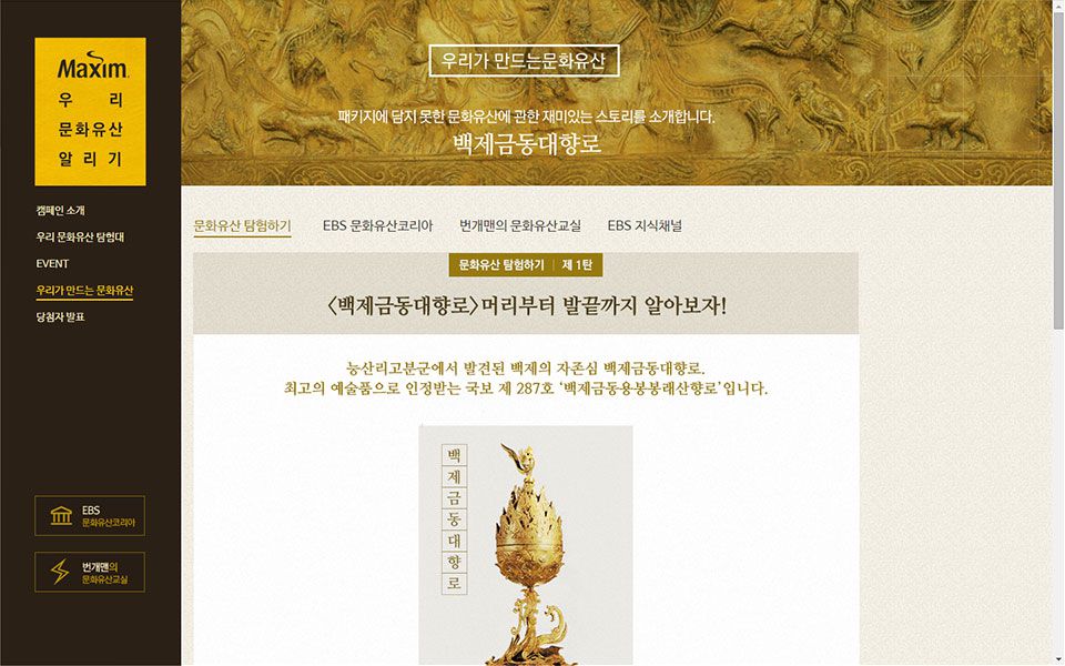 맥심의 브랜드 색인 골드와 브라운을 활용하여 유산이라는 컨셉과 맞춰 고풍스러운 디자인을 선보였다.