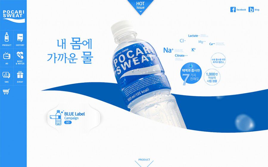 제품을 상징하는 색상인 밝은 파란색을 사이트의 전체적으로 주조색으로 활용하였다.