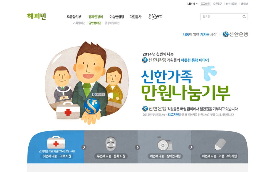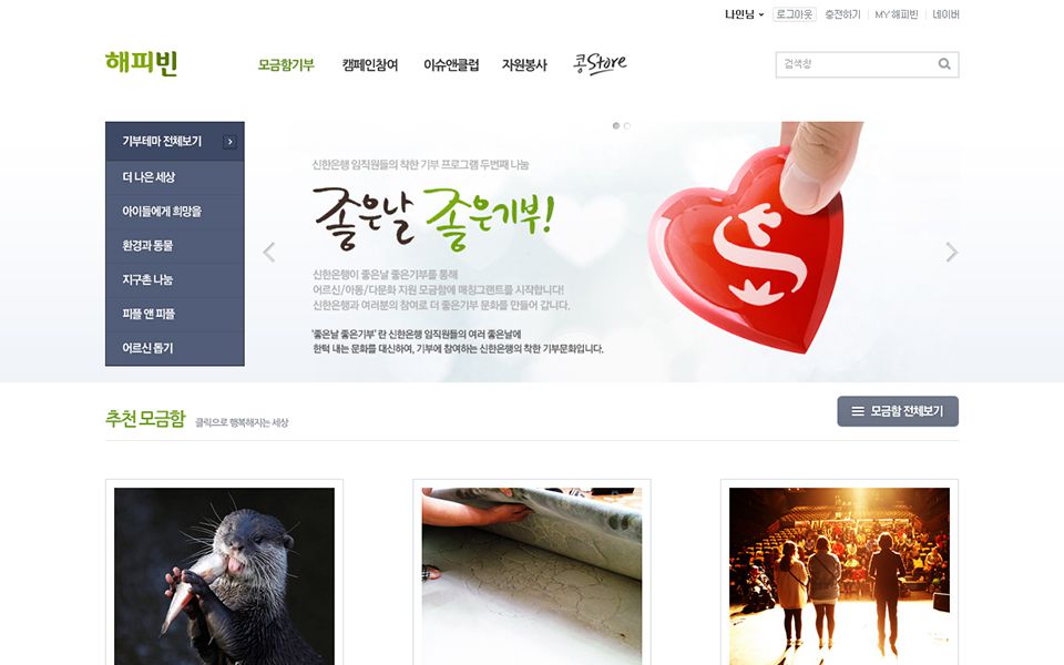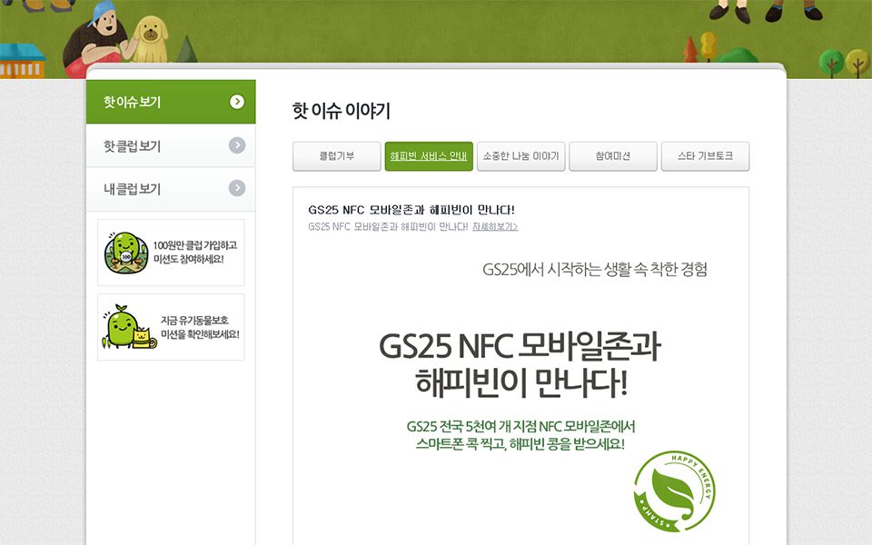 로고의 상징색인 초록으로 포인트를 주었고 흰색 배경 중심의 컨텐츠들을 컬럼별로 일러스트나 사진을 첨가하여 꾸며 놓았다.